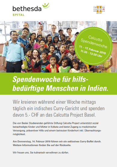 Während dieser Woche steht das Restaurant des Spitals im Zeichen Indiens und es wird jeden Tag ein indisches Curry-Gericht angeboten. Von jedem verkauften Gericht werden 5 CHF an das Calcutta Project gespendet und kommt so direkt unseren Projekten in Indien zugute.